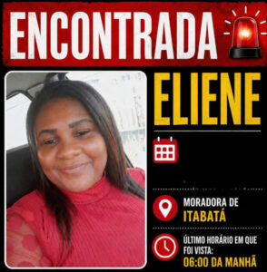 Após mais de 32 Horas de Buscas incansáveis, dona Eliene foi encontrada dormindo, em uma rua no centro do distrito de Itabatã, municipio de Mucuri Bahia, ela foi encontrada por um Entregador de um Supermercado da Cidade.