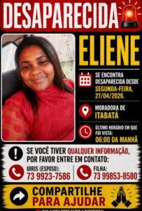 “Eliene é muito conhecida em Itabatã, e ela não pode ter ido muito longe, quem souber de informações entre em contato conosco” disse a irmã de Eliene.